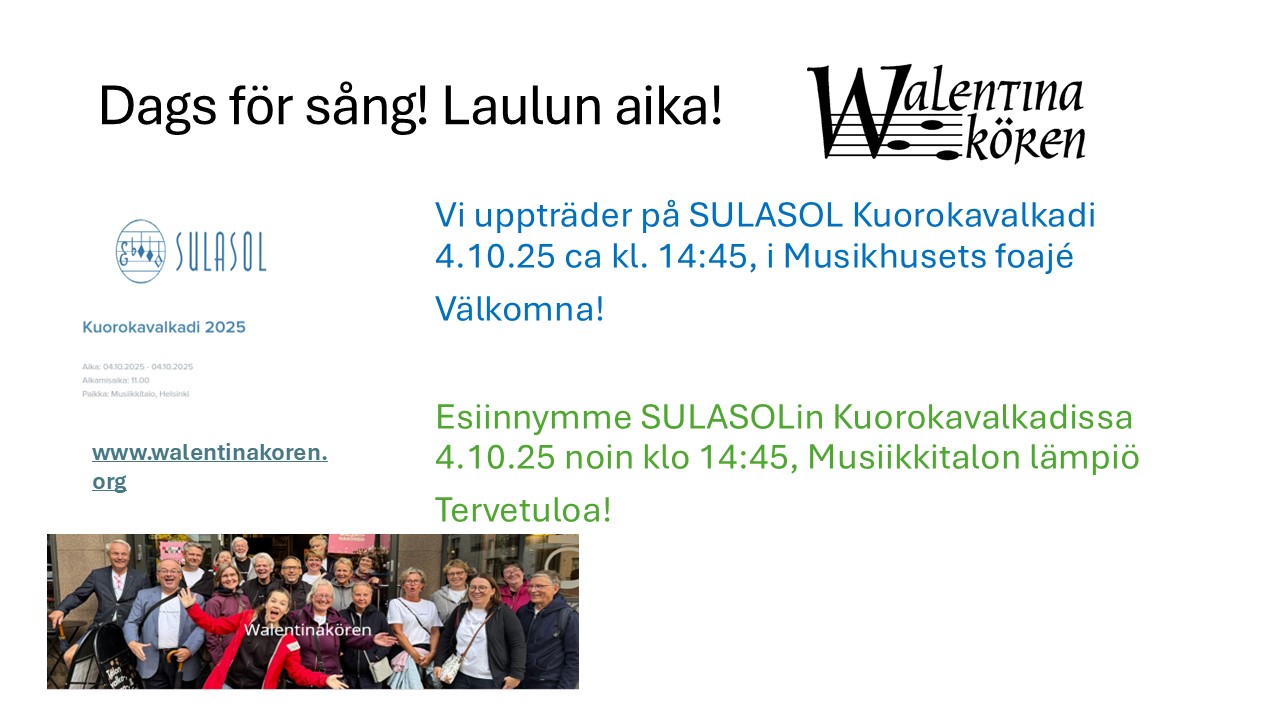 Walentinakören uppträdde vid SULASOL Kuorokavalkadi i Musikhusets foajé 19.10.2024. Vi hade igen som enda svenskspråkiga kör fått inbjudan att delta.