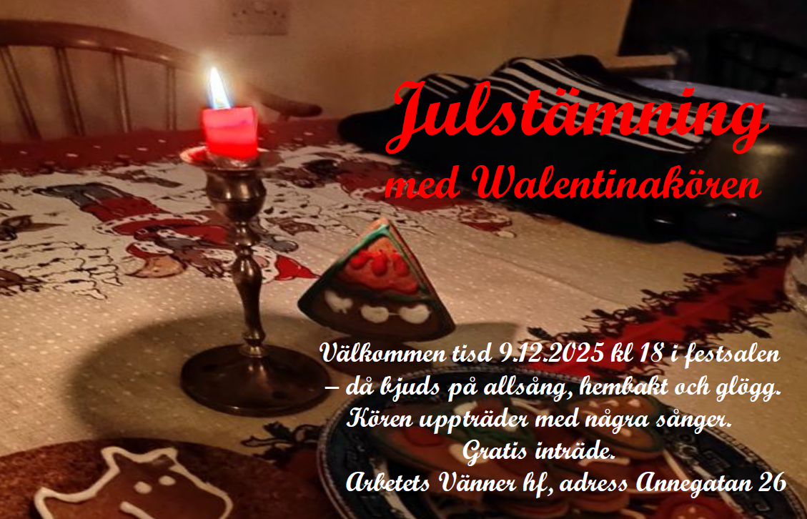 Tillställningen har både allsång och Walentina-uppträdande. Festbestyrelsen bjuder på hembakt och glögg. Gratis inträde.