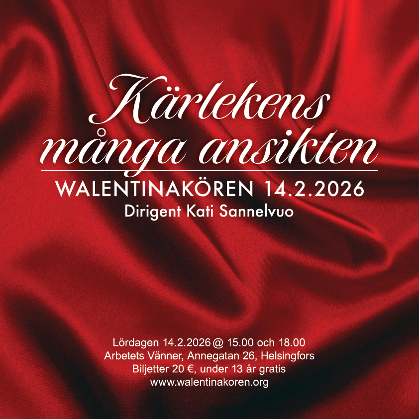 Välkommen på Walentinakörens traditionella vändagskonsert 14.2.2026 i Arbetets Vänner Huvudföreningens festsal, Annegatan 26, Helsingfors. Kören uppträder kl. 15 och kl. 18, dirigent Kati Sannelvuo.